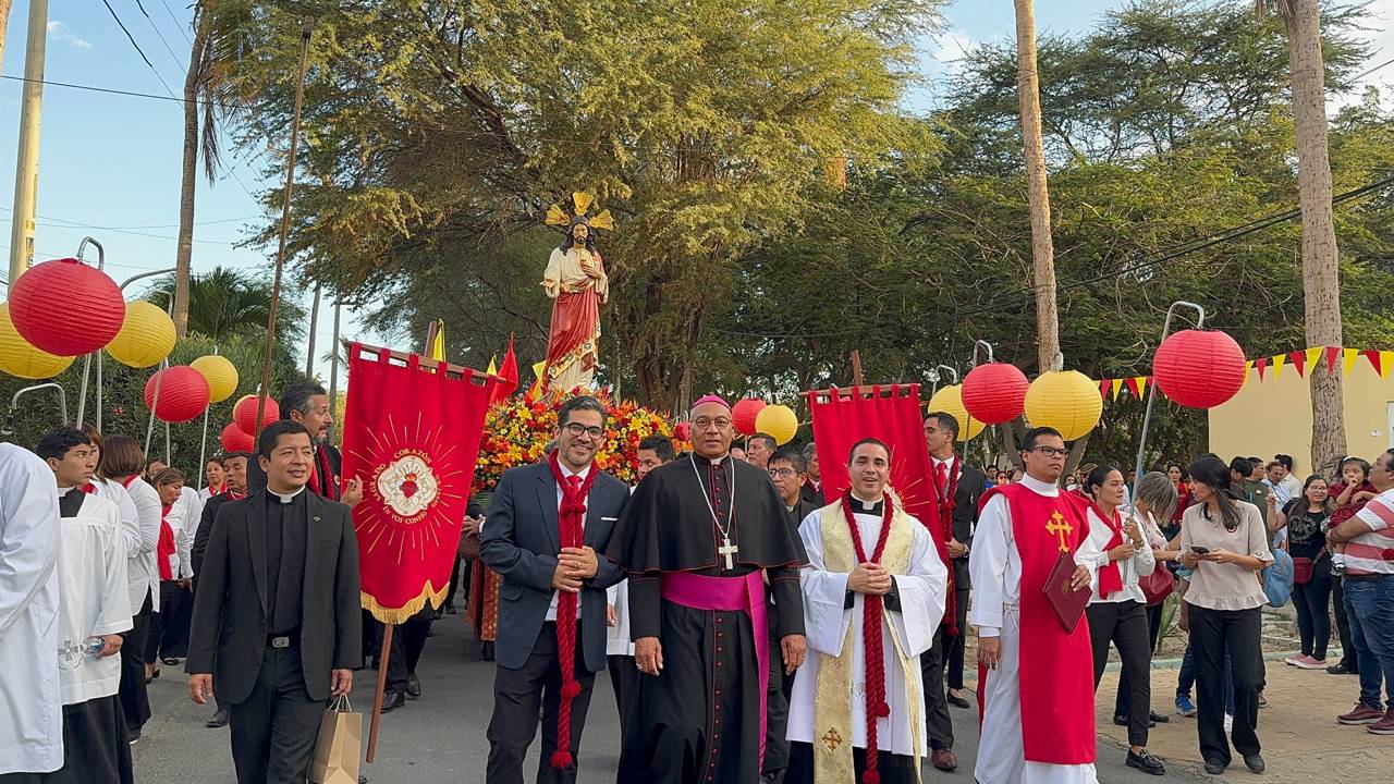 La procesión contó con la presencia de Monseñor Guillermo Elías Millares, Administrador Apostólico de la Arquidiócesis de Piura, quien acompañó a los fieles en parte del recorrido y tuvo el gesto de cargar con devoción la santa imagen, manifestando su cercanía con el pueblo y su amor al Corazón de Cristo.