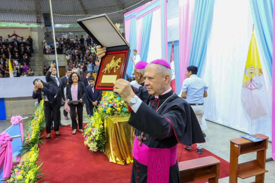 24 de agosto de 2024 (Oficina de Prensa).- En medio de un clima de profunda piedad mariana, más de 3000 familias piuranas se reunieron en el Coliseo del Colegio Salesiano – Don Bosco, para rezar a los pies de la Virgen María Auxiliadora, el Santo Rosario junto a Mons. Paolo Rocco Gualtieri, Nuncio Apostólico del Papa Francisco en el Perú, y a nuestro Administrador Apostólico Mons. Guillermo Elias Millares. Demostrando que somos una Ciudad no sólo profundamente Eucarística, sino también Mariana.