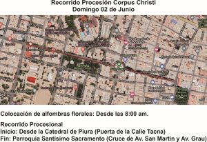 En esta gran fiesta de la fe, estarán presentes los sacerdotes de la Vicaría de Piura, nuestras autoridades, las comunidades religiosas, los fieles de las parroquias, los movimientos eclesiales, hermandades y cofradías, y los miembros de las instituciones educativas escolares y universitarias, quienes luego de la Santa Misa acompañarán a Jesús Sacramentado en Procesión con cantos y oraciones desde la Basílica Catedral de Piura hasta la Parroquia Santísimo Sacramento, en donde Mons. Guillermo impartirá a todos la bendición final.