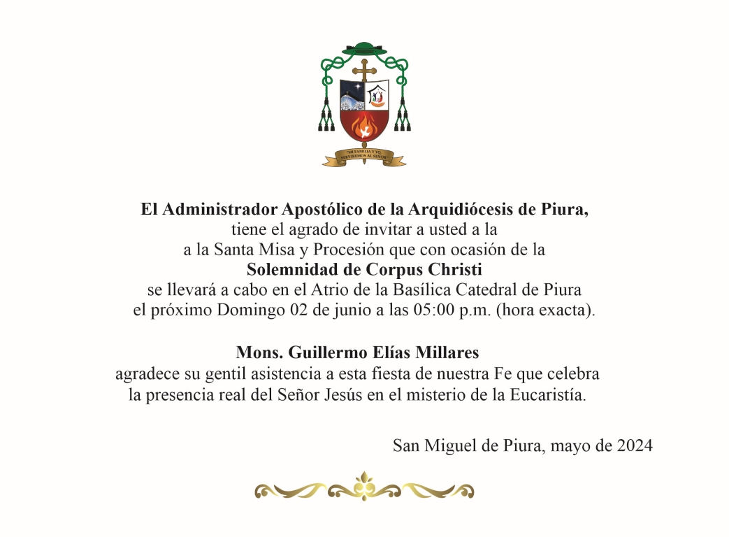 28 de mayo de 2024 (Oficina de Prensa).- Piura y Tumbes son por excelencia Regiones Eucarísticas, que adoran la presencia real de Jesús en el Santísimo Sacramento del altar. Por ello, con profunda ilusión y amor, en Piura nos preparamos para celebrar este Domingo 02 de junio la Santa Misa y posterior Procesión con ocasión de la Solemnidad del Corpus Christi, la cual se realizará desde las 5:00 p.m., en el Atrio de la Basílica Catedral de nuestra Ciudad y que será presidida por nuestro Administrador Apostólico Mons. Guillermo Elías Millares.