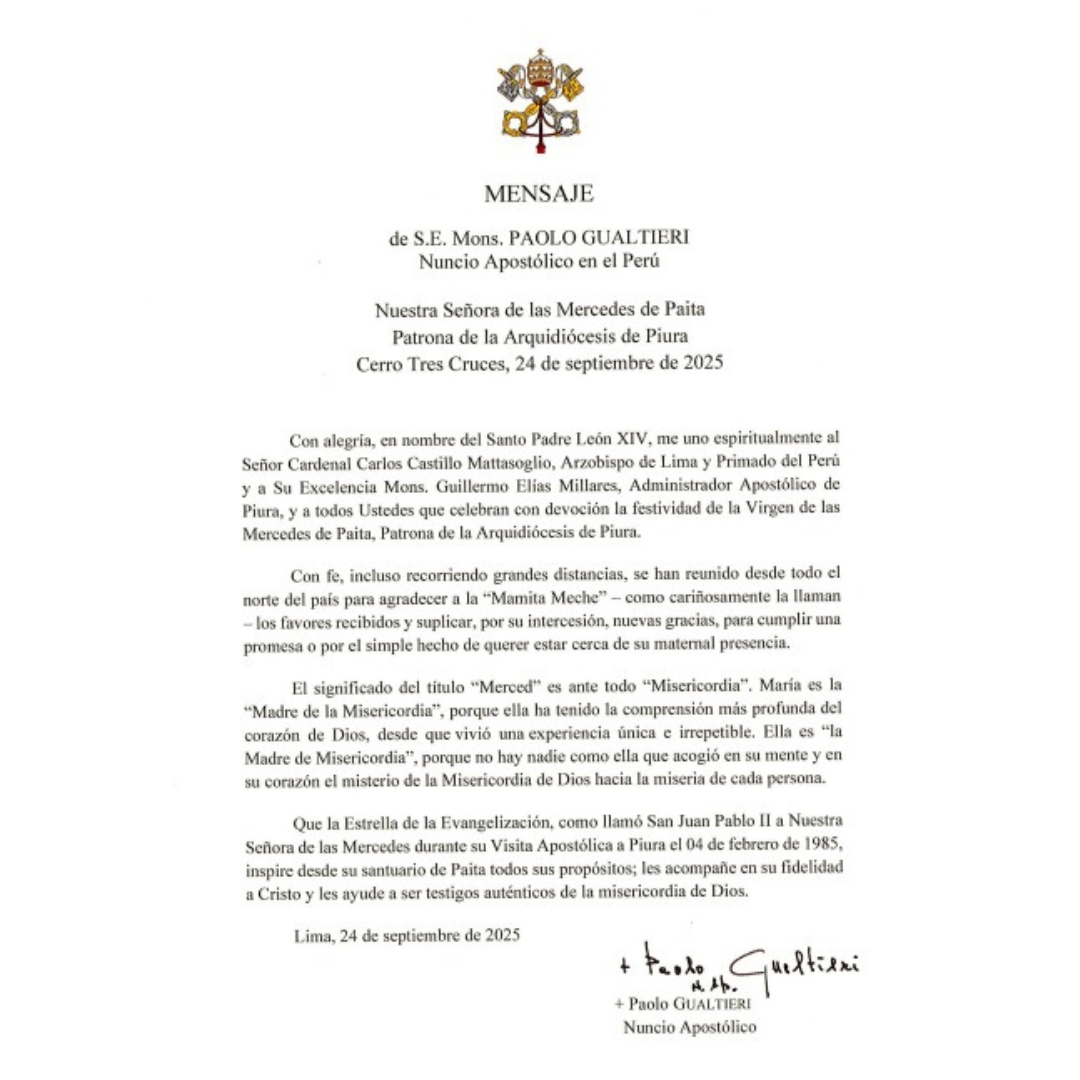Así mismo, el nuncio apostólico del Perú envió su especial saludo por nuestra festividad de la Virgen de las Mercedes.
